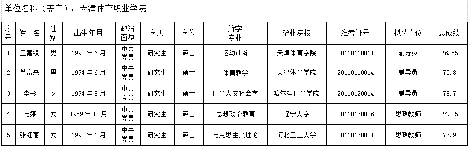 根据《天津市事业单位公开招聘人员实施办法(试行)》(津人社局发〔2011〕10号)文件精神,下列人员经笔试、面试、体检、考察等程序被确定为拟聘人员,现予公示。