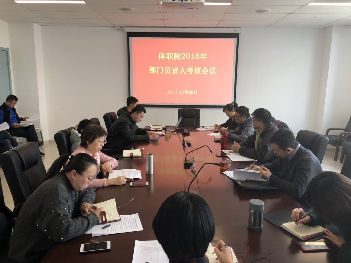 2019年1月9日下午,必赢在二楼会议室召开2018年度考核会议,院党委书记王伟、院党委副书记、院长刘钦龙、副院长魏秋月,各处室、系部负责人参会。会议由人事部负责人主持。