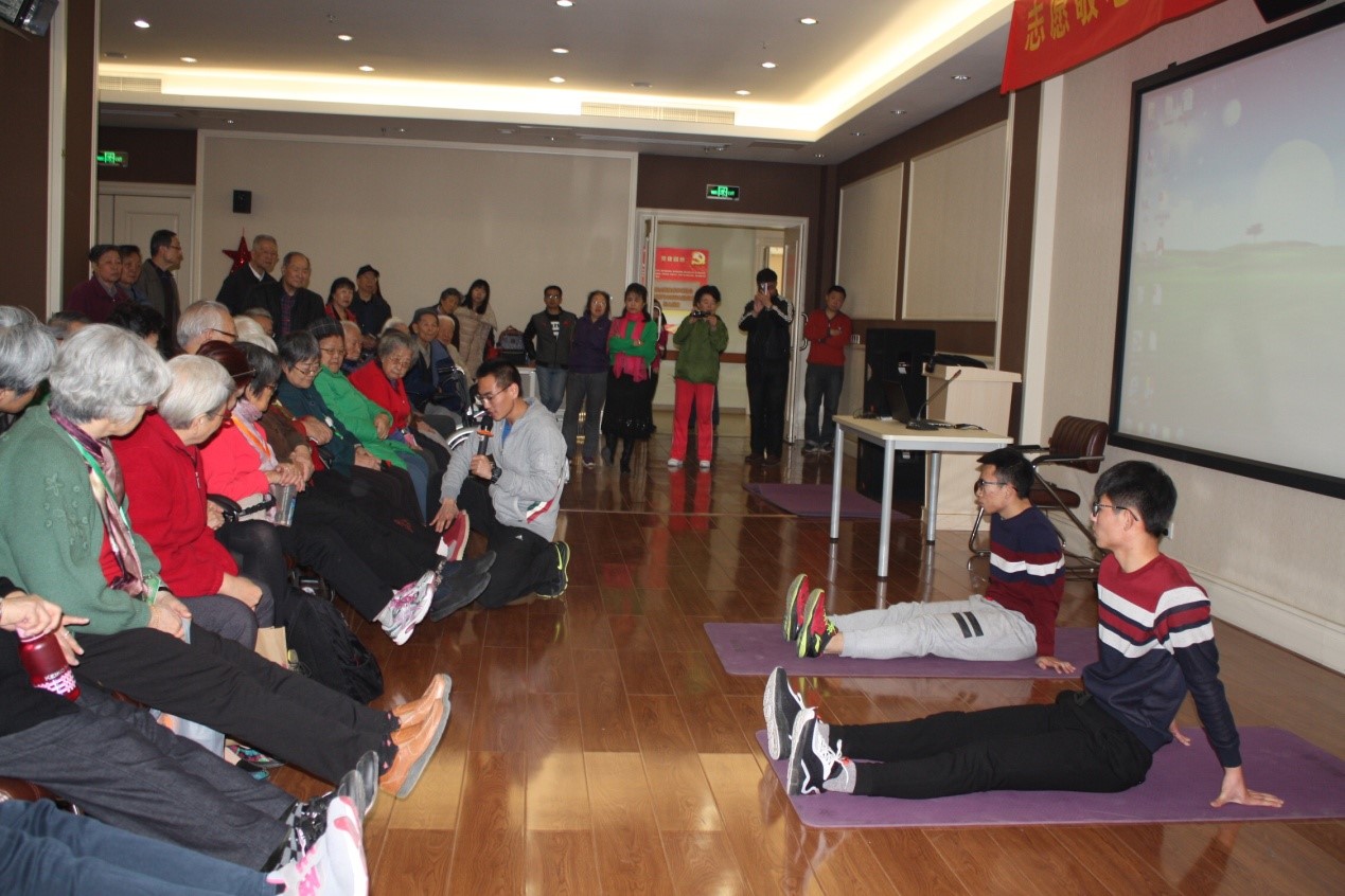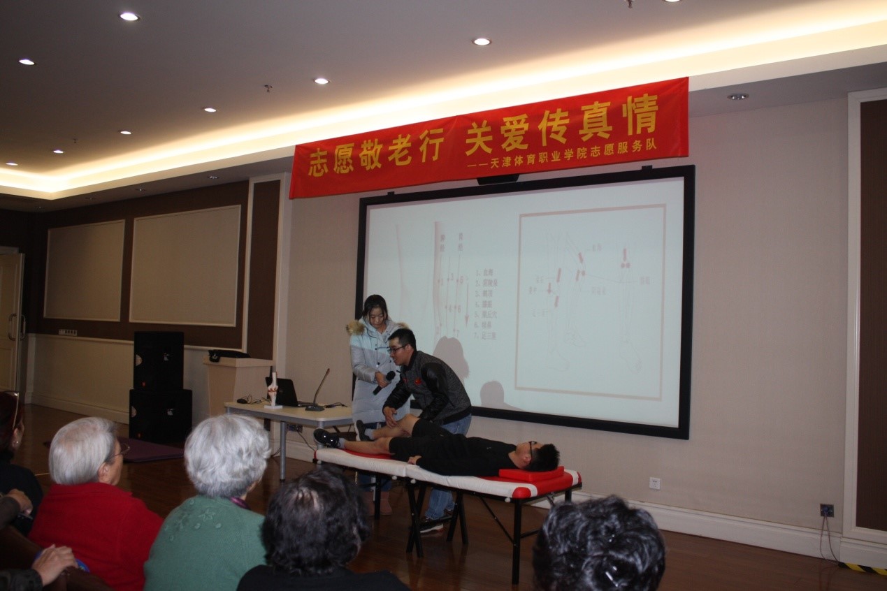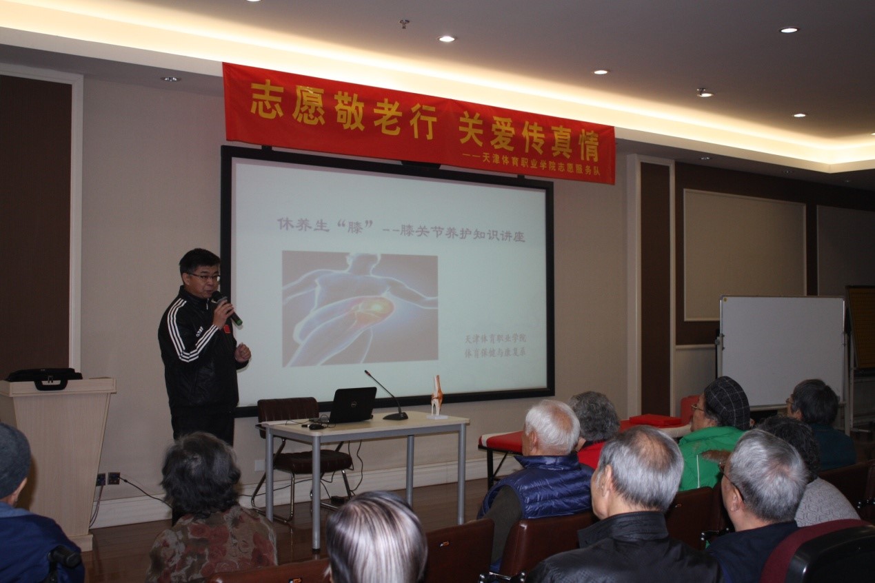 12月3日上午,按照天津市第十一届社区教育展示周,暨2017年天津市全民终身学习活动周的工作要求,学院领导高度重视,亲自带队并部署工作,经办公室组织协调,体育保健与康复系的师生到位于静海区的康宁津园老年公寓举办《休养生“膝”——老年人膝关节养护知识》主题讲座,为老年人讲解关于膝关节养护知识,带领他们实践操作并解答健康难题。